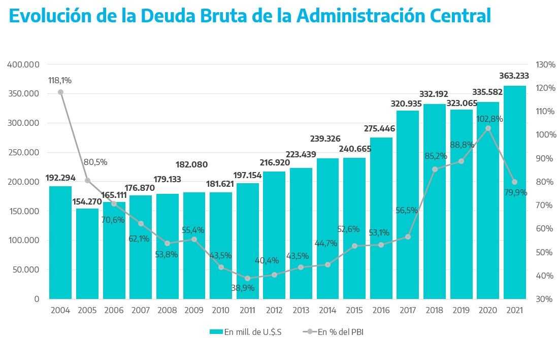 En diciembre de 2019 la deuda externa pública nacional pasó a ser de 323.065 millones de dólares, el 40% de la misma intra sector público, 22,7% organismos internacionales (mayormente el FMI por equivalente a 44.500 millones de dólares) y 37,3% se le debe al sector privado. La deuda se incrementó en 82.400 millones de dólares durante la gestión de Cambiemos y desmejoró sensiblemente su distribución, sobre todo por la perentoriedad de los plazos.