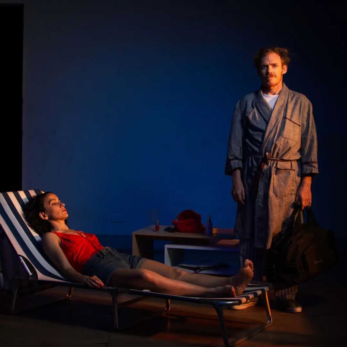 Vamos a dedicar unas líneas a la puesta minimalista y muy efectiva que presenta la obra, donde hay que destacar el estupendo diseño lumínico de Pablo Rojas, jugando con las penumbras que envuelven los diálogos de la pareja y los rayos de sol que ingresan por el gran ventanal. El diseño escenográfico de Paula Molina con esa reposera como centro de escena y el vestuario que caracteriza a los personajes también de Paula, son ítems que contribuyen a la belleza de una puesta que transmite mucho.