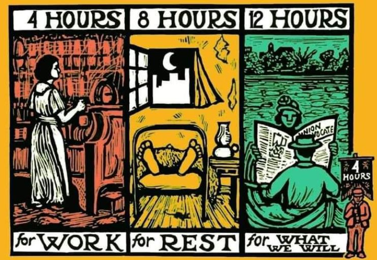 Hoy cuando se habla de nuevo, a través de una contra revolución silenciosa y patronal, que se da en el campo de batalla del “sentido común”, a través de medios oligopólicos de comunicación y tecnologías comunicacionales, de la jornada de los que trabajan. Y se plantea volver a jornadas bizantinas de 12 o 13 horas y se plantea flexibilizarla con “bancos de horas”, no podemos dejar de plantear todo lo contrario. Una de las luchas obreras que no debe abandonarse es justamente la de la reducción de la jornada. De ocho horas, ya tendríamos que haber pasado a 6 horas, para llegar a 4 horas. Lucha obrera por la que murieron los Mártires de Chicago y millones de trabajadores en miles de marchas y huelgas. Porque no se trata sólo de la lucha por un salario digno, se trata también de la lucha por el poder trabajar para vivir y no vivir para trabajar.