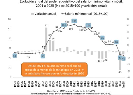 Según un estudio de CIFRA [4], teniendo en cuenta el poder de compra real del SMVM en 2015, para el 2025 quedó reducido a menos de la mitad e incluso quedó más bajo que en 1990.
