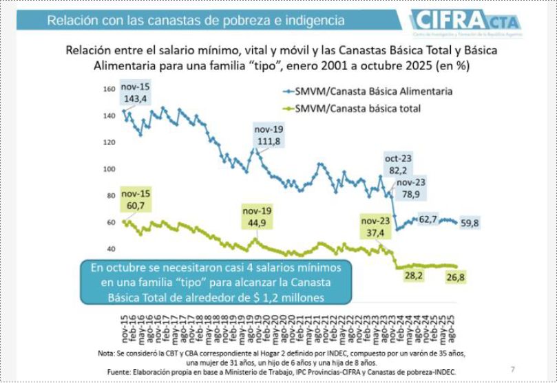 El último gráfico es el SMVM en relación a la Canasta Básica Alimentaria (CBA), línea de indigencia, y la Canasta Básica Total (CBT), línea de pobreza, para una familia tipo de enero del 2001 a octubre del 2025. Respecto a la primera es la capacidad de compra mínima para poder comprar las calorías y alimentos básicos para no ser indigente. La otra, representa los alimentos indispensables para la subsistencia más algunos bienes y servicios esenciales no alimentarios. El cómo se analiza esto está en discusión, ya que por ejemplo la CBA tradicionalmente mide las calorías mínimas que necesita una persona para subsistir, pero no analiza qué vitaminas y minerales para tener una vida