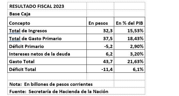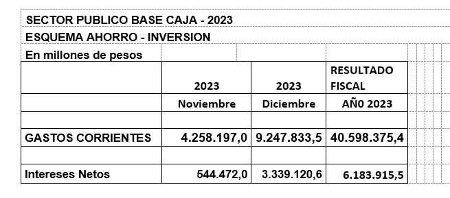 La SecretarÃa de Hacienda de la Nación publicó a fin de enero 2024 el resultado fiscal del año 2023, base caja (que contempla tanto los ingresos como las erogaciones percibidas, no las devengadas, esto es no contabiliza las obligaciones del ejercicio 2023 que van a ser canceladas en el año 2024).