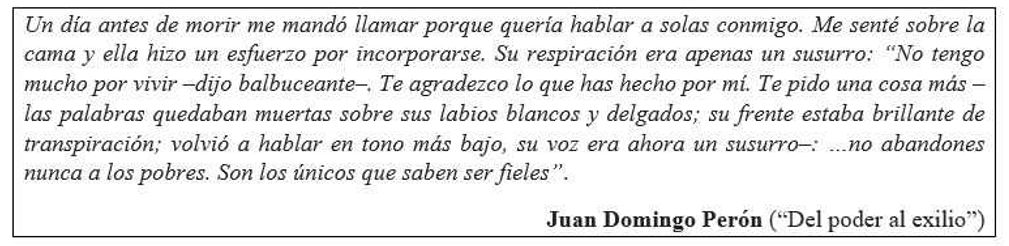 - “El peronismo nacido el 17 de octubre es una victoria del auténtico pueblo sobre la oligarquÃa. Y para que esa victoria no se pierda, como se perdió la Revolución Francesa y la Revolución Rusa, es necesario que los dirigentes del movimiento peronista no se dejen influenciar por el espÃritu oligarca […] Hay que aplaudir y gritar menos y actuar más”.