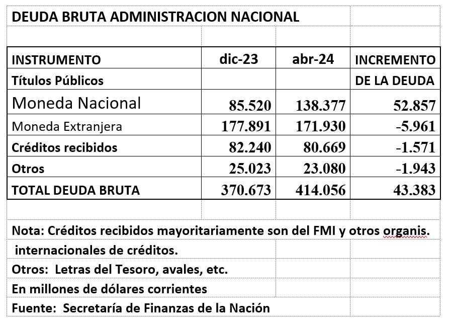 A su vez, el gobierno fue ofreciéndole a los bancos la colocación de tÃtulos del Tesoro de la Nación ajustables por inflación, que se incrementó sideralmente, no solo absorbiendo parte de las Leliq que los bancos depositaban en el BCRA, sino poniendo en funcionamiento la bicicleta financiera con el ingreso de dólares al sistema económico local, por dichos tÃtulos en pesos, por el equivalente a 52.857 millones de dólares al 30 de abril 2024.