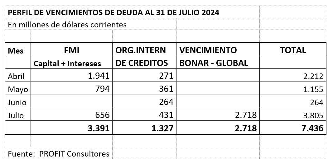 En ese frágil marco deben pagarse las obligaciones de deuda externa al 31 de julio de 2024, por 7.436 millones de dólares y, desde agosto 2024 el comienzo de la amortización del capital de los tÃtulos canjeados en la gestión del ministro MartÃn Guzmán, el 31 de agosto de 2020.