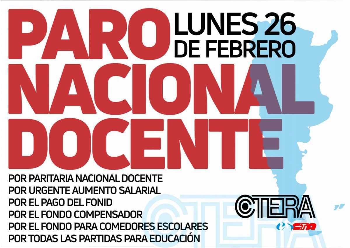 La Confederación de Trabajadores de la Educación de la República Argentina (Ctera) confirmó el paro nacional con movilización para el próximo lunes 26 de febrero, dÃa en el que estaba previsto el comienzo de clases en casi diez provincias. La medida es en rechazo al ajuste que está llevando adelante el gobierno de Javier Milei sobre el presupuesto educativo.
