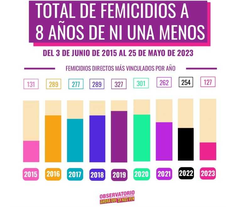 DÃas previos al 3 de junio, el observatorio de violencias de género “Ahora que sà nos ven” en conjunto con “Feminacida” presentaron un informe estadÃstico con datos relevados entre el 3 de junio de 2015 al 25 de mayo de 2023, con el objetivo de “visibilizar una de las formas más extremas que cobra la violencia por motivos de género y denunciar la falta de polÃticas públicas destinadas a aplicar las leyes de protección de los derechos humanos de las mujeres y personas LGBTIQ+ vigentes desde hace años en todo el territorio nacional”.