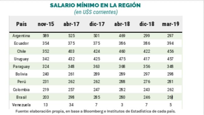 En 2015, al finalizar el gobierno de Cristina Fernández de Kirchner, el Salario Mínimo Vital y Móvil (SMVM) de los trabajadores argentinos, era por lejos el más alto de la región. Según un informe de la UNDAV [3], para noviembre del 2015 estaba en u$s589 (monto que varía según el dólar que se tenga en cuenta. Esta vez fue calculado en dólares corrientes), cuando el siguiente SMVM más alto era el de Ecuador de u$s354.