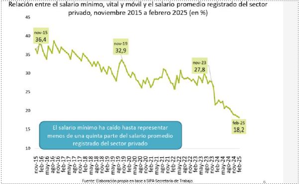 Entre 2015 y 2025 el SMVM pasó de equivaler al 36% del salario promedio privado registrado a sólo el 18%. O sea que se partió a la mitad su peso relativo, quedando como un piso salarial cada vez más irrelevante.