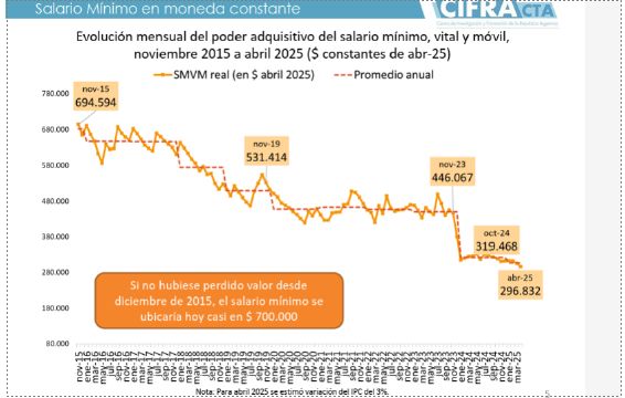 Según un estudio de CIFRA [4], teniendo en cuenta el poder de compra real del SMVM en 2015, para el 2025 quedó reducido a menos de la mitad e incluso quedó más bajo que en 1990.