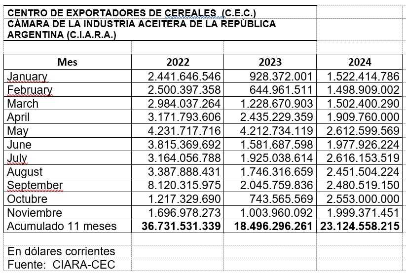 En octubre y noviembre 2024 se liquidaron más exportaciones que en igual perÃodo de los años 2022 y 2023.