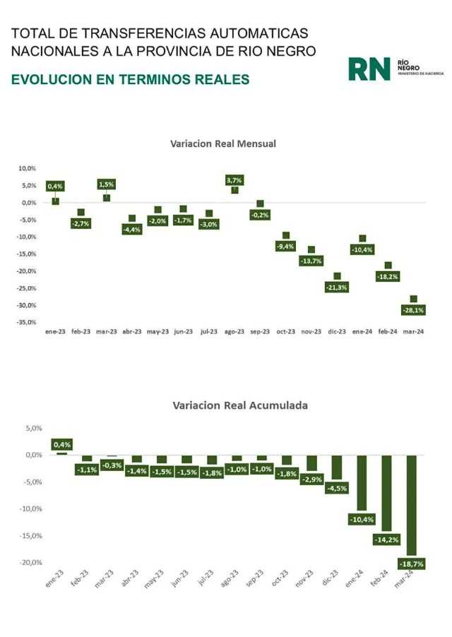 Esta caÃda, la reducción de la actividad económica, la paralización de obras públicas estratégicas y el retiro de fondos nacionales como el FoNID, que representa un porcentaje alto del salario docente rionegrino ya generan consecuencias en la provincia. La inflación junto con la baja actividad económica afecta negativamente a la recaudación en términos reales al reducir el poder adquisitivo de ciudadanos y empresas, disminuyendo asà el consumo y la inversión.